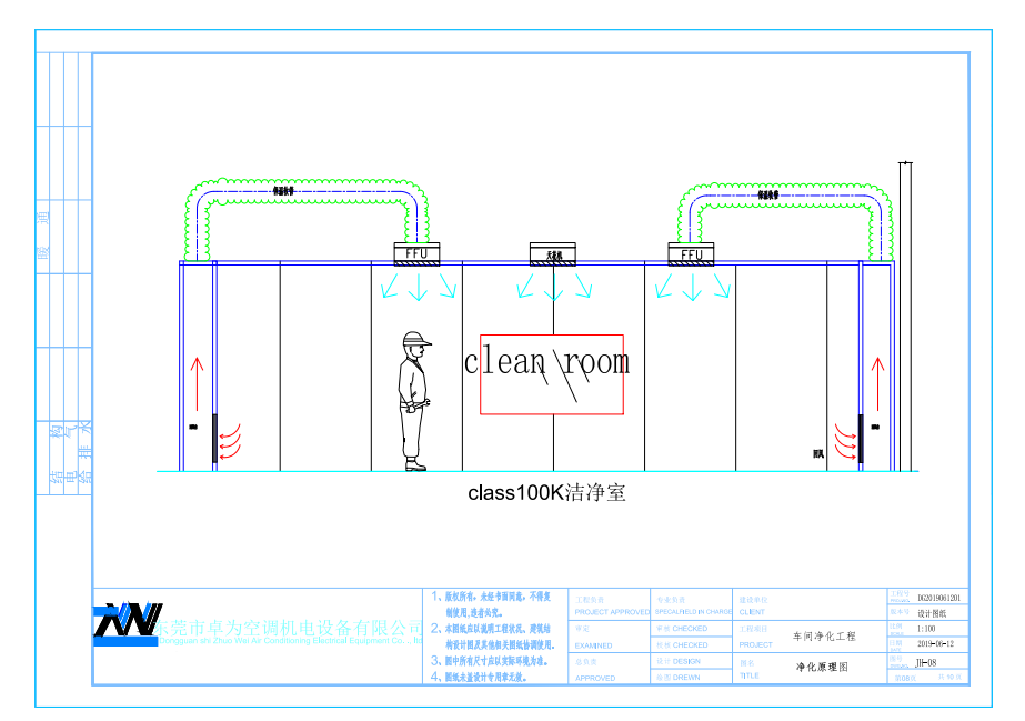 潔凈度的實(shí)現(xiàn)是通過布置在車間上的FFU高效過濾送風(fēng)單元過濾,足夠的換氣次數(shù)來實(shí)現(xiàn)的,新風(fēng)采用初效過濾后送入車間。